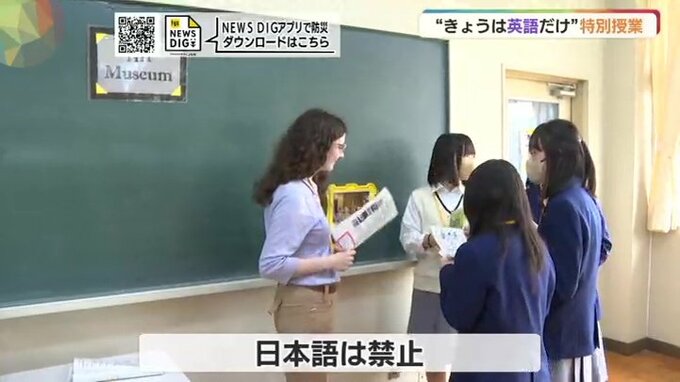 “EnglishTown(英語の町)”と称された教室に集まったのは、山口県下松市の華陵高校英語科の1年生30人あまりです。きょうは日本語が禁止。英語だけで1日を過ごします。生徒は、ジムや美容院などに見立てたブース…