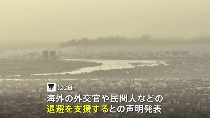 北東アフリカ・スーダンの情勢が悪化するなか、スーダン軍は各国の外交官や民間人の退避を支援する声明を出しました。スーダンでは、軍と準軍事組織RSFとの衝突でこれまでに400人以上が死亡しています。軍は22日、…