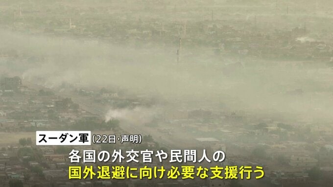 アフリカ北東部のスーダンで、軍と準軍事組織の戦闘が続く中、軍は、外国人の国外退避を支援すると発表しました。スーダンで続く軍と準軍事組織「RSF」の戦闘では、これまでに400人以上が死亡しています。こうした…