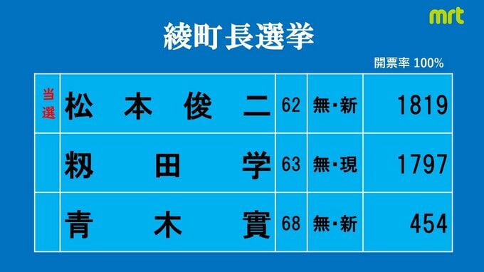 綾町長選挙 新人 松本俊二氏が初当選 宮崎放送 2023年4月23日(日) 19:55 国内 任期満了に伴う綾町長選挙は23日投開票され、無所属で新人の松本 俊二氏が初当選しました。 初当選した松本俊二氏