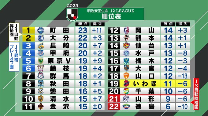 いわきは16位から19位へと3つ順位を落としました。