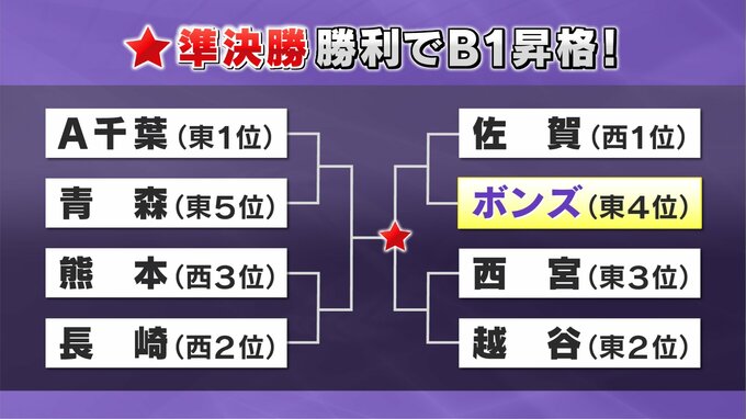 ボンズはこの後、B1昇格をかけたプレーオフに臨みます。東地区4位のボンズの初戦の相手は、西地区1位の佐賀バルーナーズです。プレーオフは先に2戦勝利したほうが次に進めるという方式で、準決勝に勝利し、決勝に進出した2チームがB1昇格となります。
