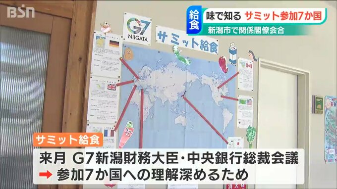 来月、朱鷺メッセで「G7新潟財務大臣・中央銀行総裁会議」が開かれるのを前に料理を通して、アメリカやイギリスなど参加7カ国への理解を深めてもらおうと、新潟市が市内172の小・中学校などで実施しています。