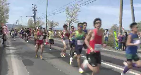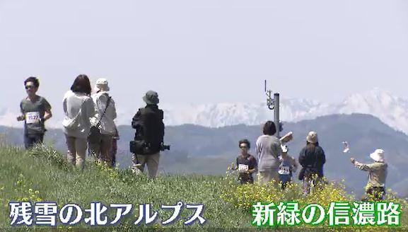快晴に恵まれ、ランナーは残雪の北アルプスを望みながら、新緑の信濃路を満喫していました。
