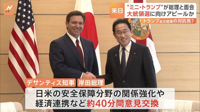 来年のアメリカ大統領選挙に向けて存在感を示す狙いがありそうです。ミニ・トランプと称される人物が来日し、岸田総理と面会しました。きょう、総理官邸に現れたのはアメリカ・フロリダ州のデサンティス知事。来年…