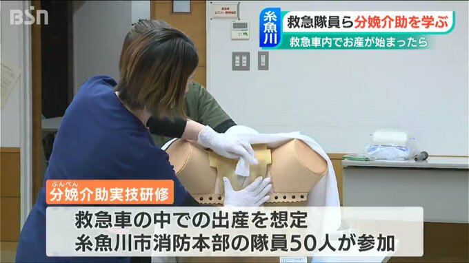 この研修は救急車の中で出産に至った場合を想定したもので、救急救命士29人を含む糸魚川市消防本部の隊員50人が参加しました。