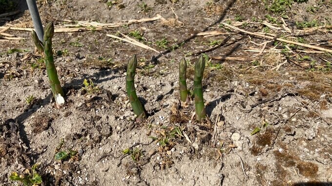 25日午前9時ごろ、喜多方市内の農家で撮影された大きく曲がったアスパラガス。霜の影響でアスパラガスが曲がる「軟化現象」が見られ、すべて廃棄処分になったということです。