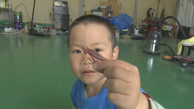 父・祐也さんが働く市内の自動車の整備場で19日午後7時ごろ、海翔くんがこのキリギリスを見つけ、祐也さんが捕獲しました。