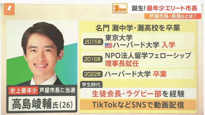 兵庫県・芦屋市に史上最年少市長が誕生しました。高島崚輔氏(26)は名門・灘高校からハーバード大卒業とその経歴はまさにエリート。しかし、選挙活動中には「若すぎる」などの声も…。劣勢に立たされる中で訴えた…