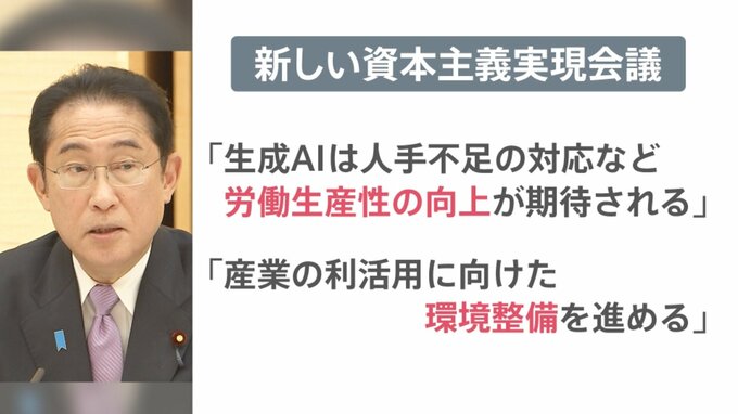 4月25日夕方、政府は「新しい資本主義実現会議」を開催し、岸田総理は「生成AIは、人手不足の対応など、労働生産性の向上が期待される。産業の利活用に向けた、環境整備を進める」と発言しました。
