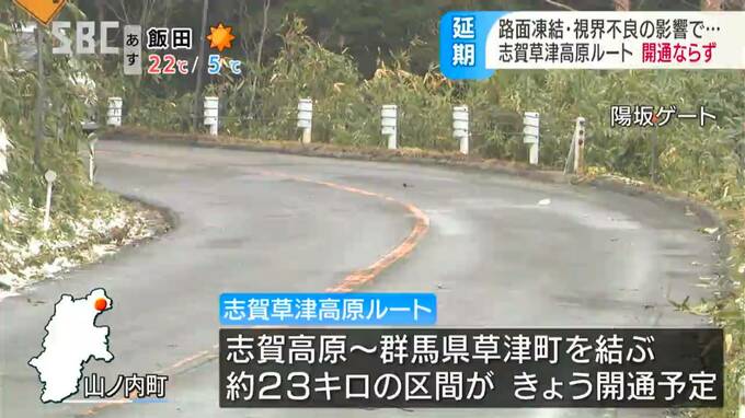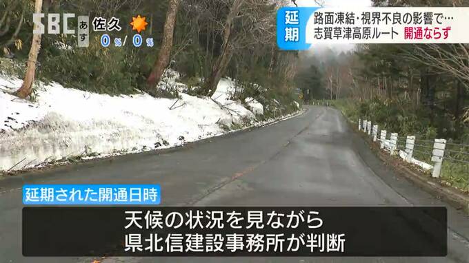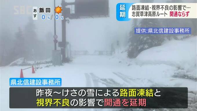 道路を管理する県北信建設事務所は、昨夜(25日)からけさにかけて降った雪の影響で路面が凍結したことや、霧によって視界が悪くなっていることから開通を延期すると発表しました。