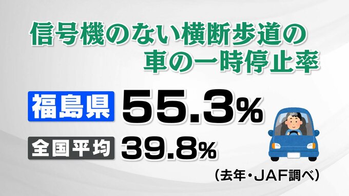 ところが、JAF=日本自動車連盟が全国の信号機のない横断歩道で、車の一時停止率を調べたところ、福島県は55.3%でした。全国平均の39.8%を上回り、全国9位となりましたが、およそ2台に1台が違反していることになります。