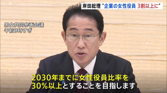 岸田総理は東証のプライム市場に上場している企業全てについて、2030年までに女性の役員の比率を30%以上にすることを目指すと明らかにしました。岸田総理「日本を代表するプライム市場上場企業について、2030年ま…