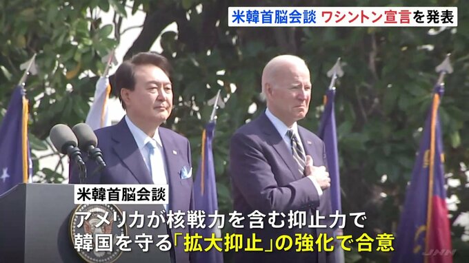 アメリカのバイデン大統領と韓国の尹大統領は、アメリカが核戦力を含む抑止力で韓国を防衛する「拡大抑止」の強化策を盛り込んだ「ワシントン宣言」を発表しました。ホワイトハウスで行われた米韓首脳会談で両首脳…