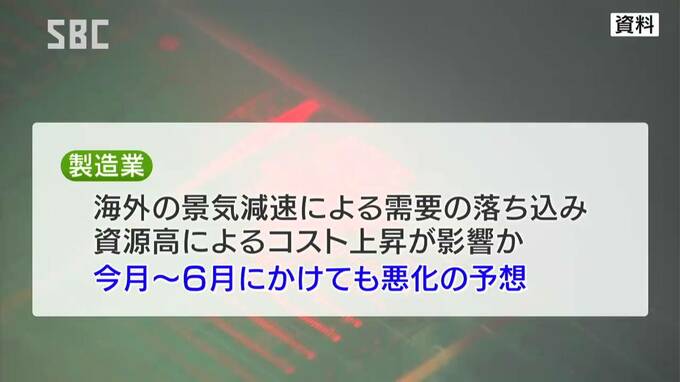製造業については、海外の景気減速により需要が落ち込んだことや、資源高によるコストの上昇が影響したとみられ、今月(4月)から6月にかけても悪化が予想されています。