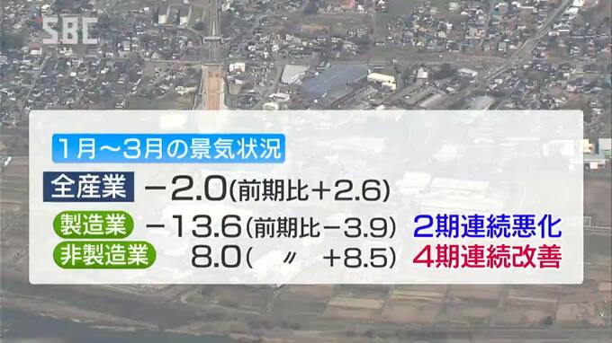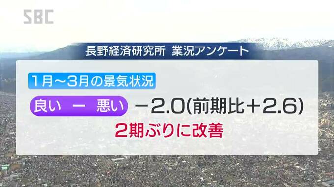 長野経済研究所が行った調査で、県内企業の今年1月から3月までの景気の状況を示す「業況」は、全産業で2期ぶりに改善した一方、製造業は2期連続で悪化しました。