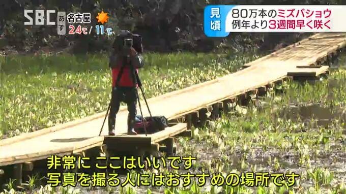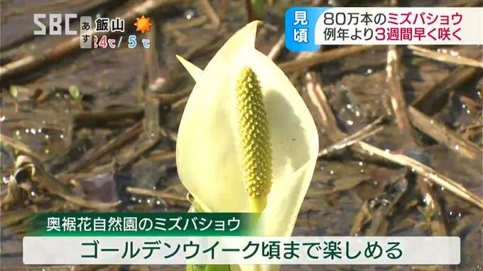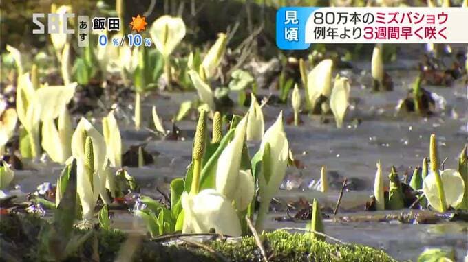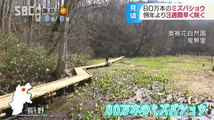 国内有数の群生地として知られる長野市鬼無里(きなさ)の自然園では、早くもミズバショウが見ごろを迎えています。