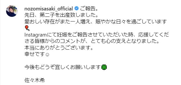 27日、女優・佐々木希さんが自身のインスタグラムで第2子出産を公表しました。