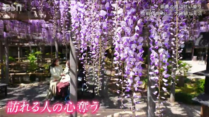 新潟市江南区の豪農の館、北方文化博物館では例年より1週間も早く藤の花が見頃を迎えています。今年も甘い香りで訪れた人を魅了しています。 【北方文化博物館 佐藤隆男 副館長】「美しい香りのいい藤が咲くよう…
