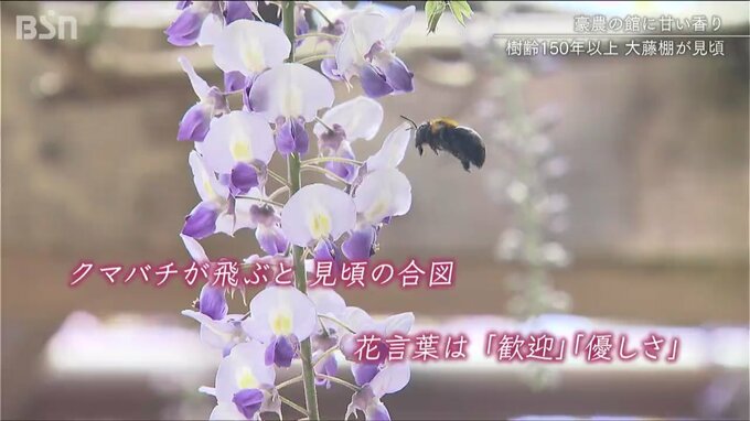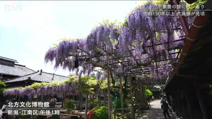 新潟市江南区の豪農の館、北方文化博物館では例年より1週間も早く藤の花が見頃を迎えています。今年も甘い香りで訪れた人を魅了しています。