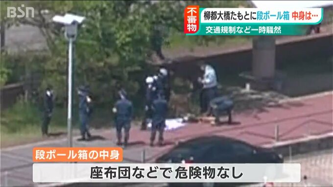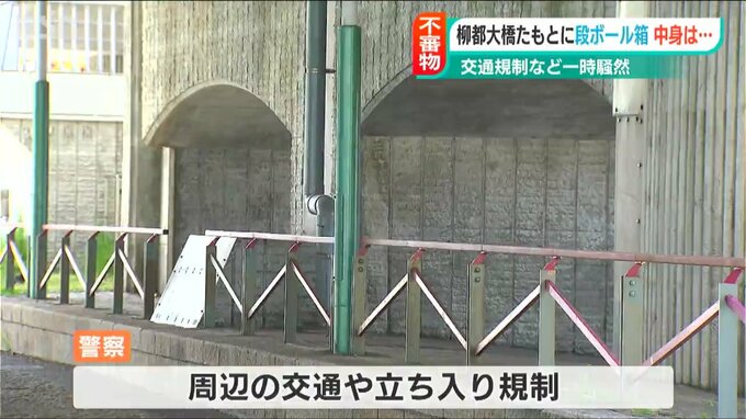 警察によりますと、パトロール中の警察官が午前10時35分ごろに、柳都大橋の近くにいた人から「昨日からダンボール箱が置いてある」との情報を受けたということです。