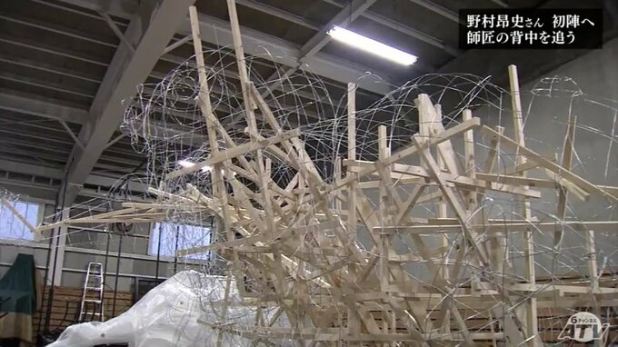 第7代ねぶた名人になった竹浪比呂央さんの弟子で、この夏、初陣を飾る新人ねぶた師が野村昂史(のむら・たかし)さんです。手がけるのは祭へ新規参入した運行団体、「プロクレアねぶた実行プロジェクト」。大役への抜擢で緊張感に包まれながら制作に打ち込んでいます。