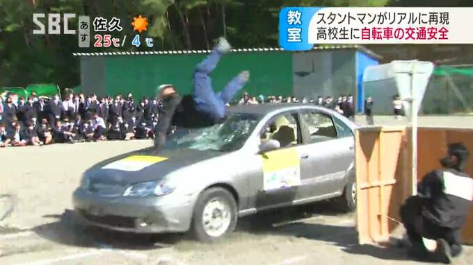 高校生を対象に、スタントマンが事故を再現する交通安全教室が開かれました。危険な自転車走行による交通事故の場面が再現されたのは、下諏訪向陽高校。交通安全教育には500人近い生徒が参加しました。自転車の事…