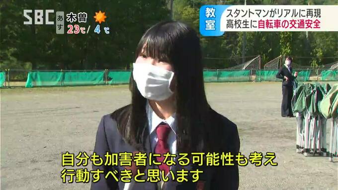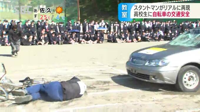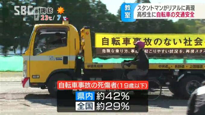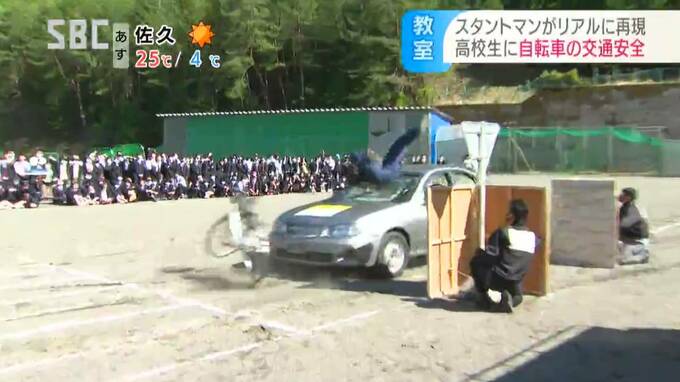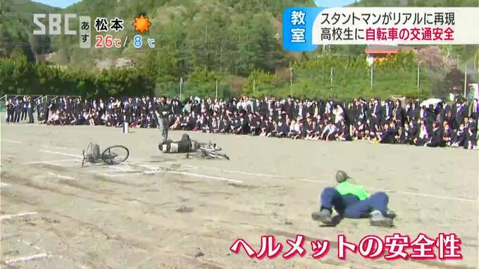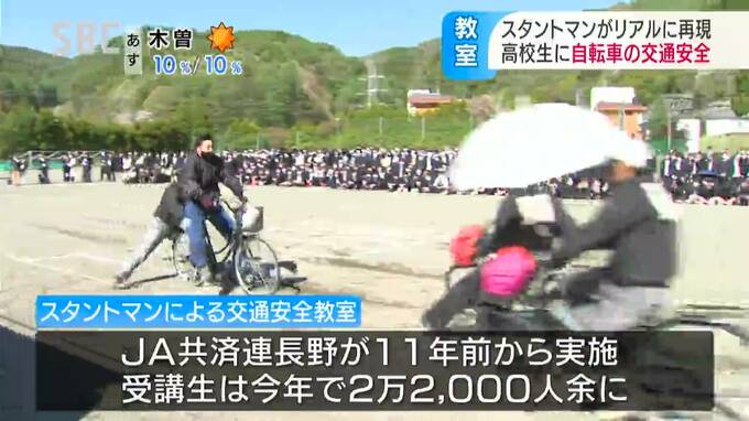 スタントマンの交通安全教室は、JA共済連長野が11年前から取り組んでいて、自転車事故の恐さを学ぶ高校生は、今年で2万2000人を超えるということです。