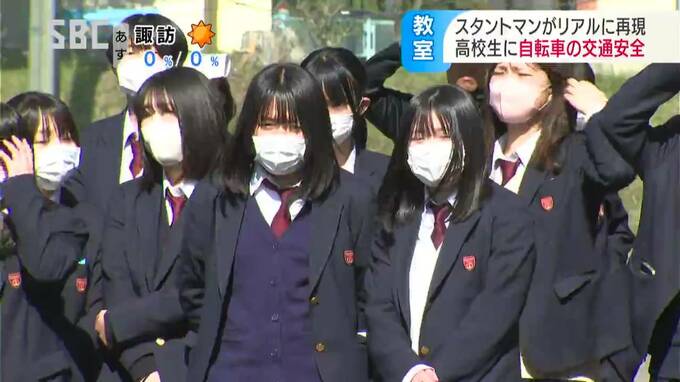危険な自転車走行による交通事故の場面が再現されたのは、下諏訪向陽高校。交通安全教育には500人近い生徒が参加しました。