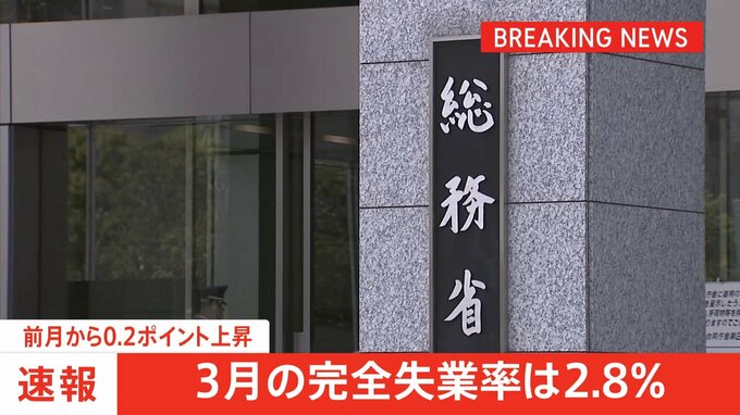 総務省がきょう発表した労働力調査によりますと、全国の3月の完全失業率は前の月から0.2ポイント上昇し、2.8%でした。また、完全失業者数は193万人で、21か月ぶりに増加しています。