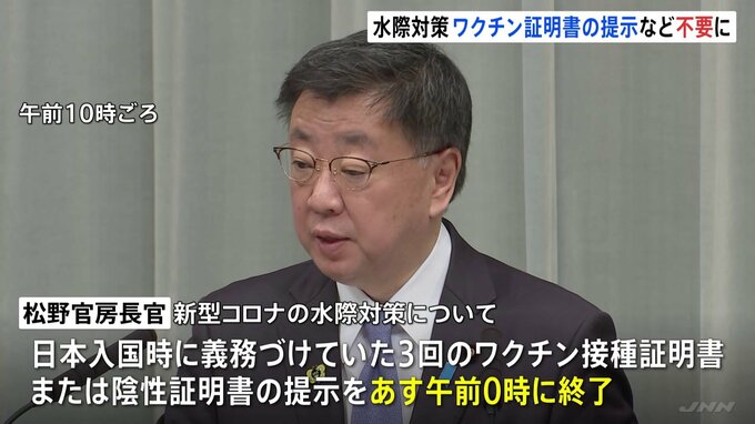 松野官房長官は、新型コロナウイルスの水際対策について、あす午前0時をもって日本に入国する人に対しては3回のワクチン接種証明書、または陰性証明書の提示を求めないよう変更すると発表しました。この措置は、新…