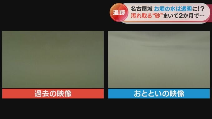 名古屋市が石垣の調査で堀の水量を減らしたため、2か月前と同じ状態ではありませんが、場所によっては水底が見えています。水中映像、過去とおとといで見比べてみると…濁りが薄まり、少し透明度が高まったようにも見えます。