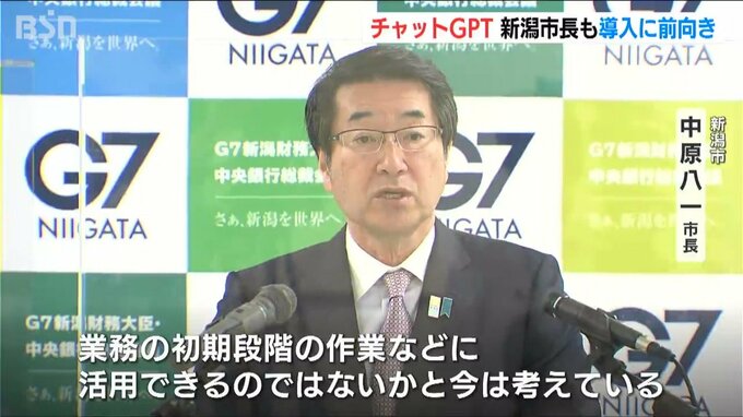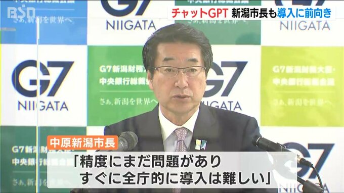 新潟市の中原市長は庁内業務での導入に前向きな姿勢を示した上で、精度にまだ問題があり、すぐに全庁的に導入するのは難しいという見方を示し、「使う場面を慎重に考えていかなければならない」と述べました。