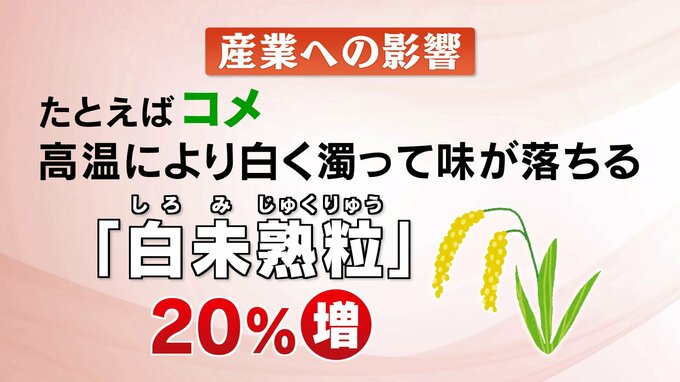 農業を例にとりますと、コメは白く濁って味が落ちる「白未熟粒」が20%増加します。