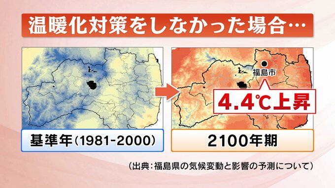 これは、福島県内の気候変動の影響を予測したものです。化石燃料に依存して、温暖化対策を行わなかった場合で、時間を動かしていきます。そうすると、2100年までに福島市では、平均気温が4.4度上昇すると予測されています。