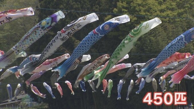 今年も約450匹のこいのぼりが設置され、山あいを抜ける風にのって気持ちよさそうに泳いでいます。