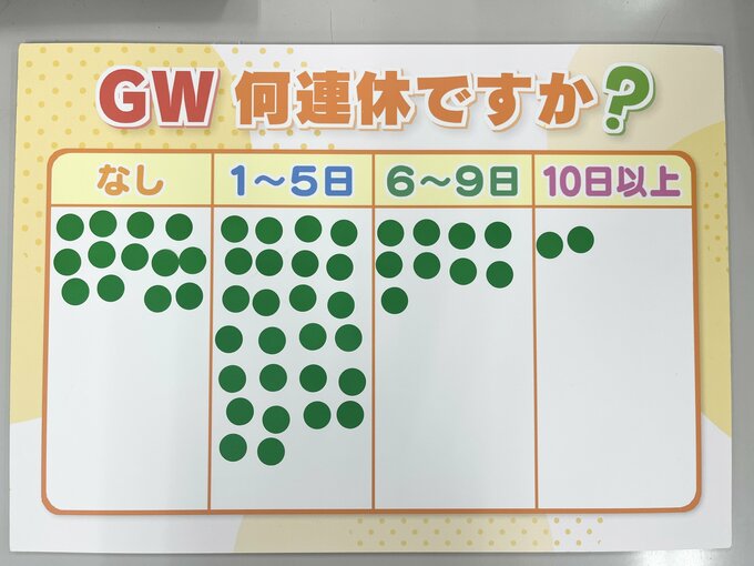1日~5日という方が最も多かったんですが、中には、10日以上という方も2人いました。お仕事の方も、お休みの方も充実した連休となればいいですね。