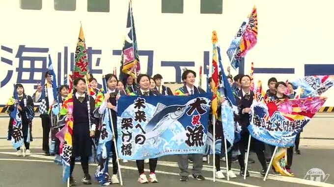 青森県大間町の魅力をPRする活動を行っている地元の高校生たち28日、今シーズン初めてフェリーふ頭で大漁旗を降って乗客を出迎えました。※めんちょこ活動部「よぐきたのー」フェリーを出迎えたのは、青森県立大間…
