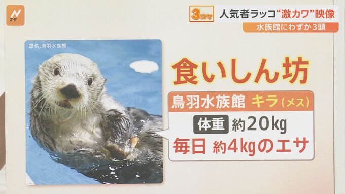 そしてラッコは食いしん坊なんです。鳥羽水族館のキラちゃんは体重約20kgですが、毎日約4kgのエサを食べます。人間に例えると60kgの男性が12kg食べるということです。また、体温を保つために皮下脂肪が少ないのでたくさん食べなければいけないということです。