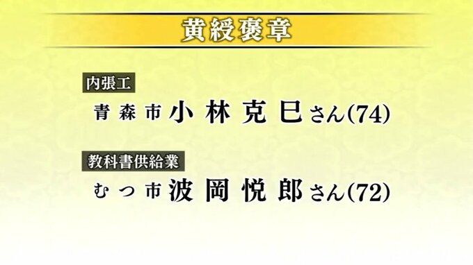 特定の分野で功績のあった人に贈られる春の褒章の受章者が発表され、青森県内からは8人が選ばれました。業務に励み、ほかの模範となっている人に贈られる黄綬褒章には、青森市の内張工・小林克巳さんと、むつ市の…