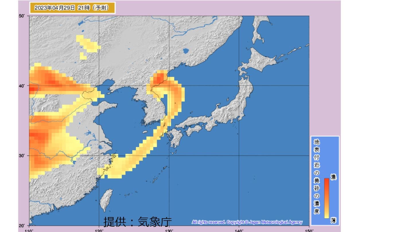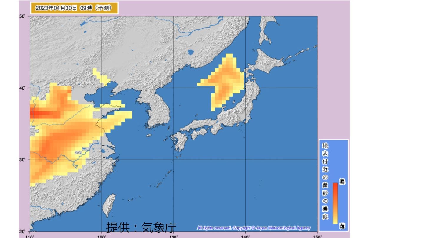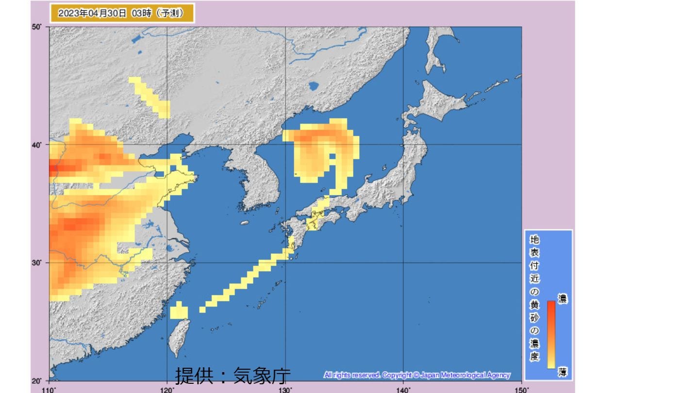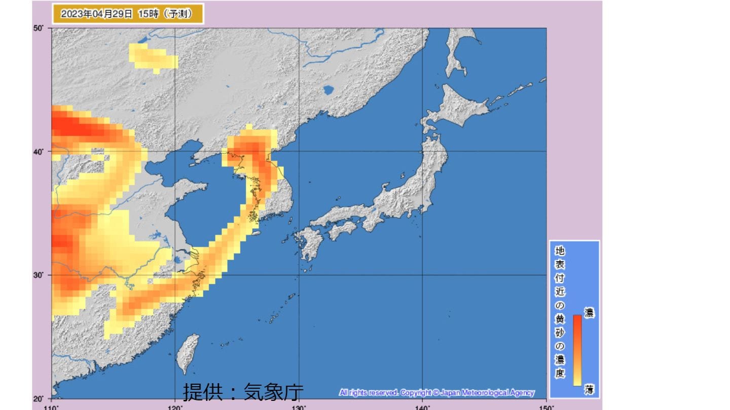 気象庁の黄砂解析予測図によりますと、黄砂はあす(4月29日)夜に西日本に到達するとみられていて、中国地方・四国地方を30日の未明に通り抜け、30日の午後には北海道・北東北を飛来する予測となっています。