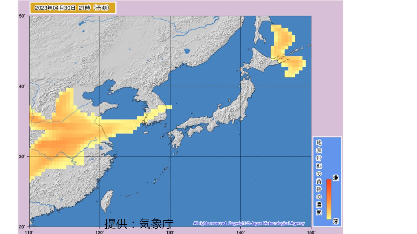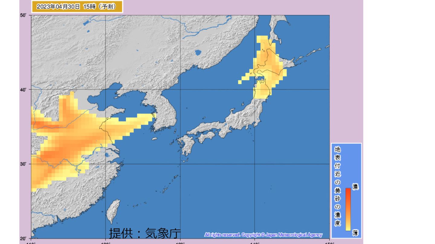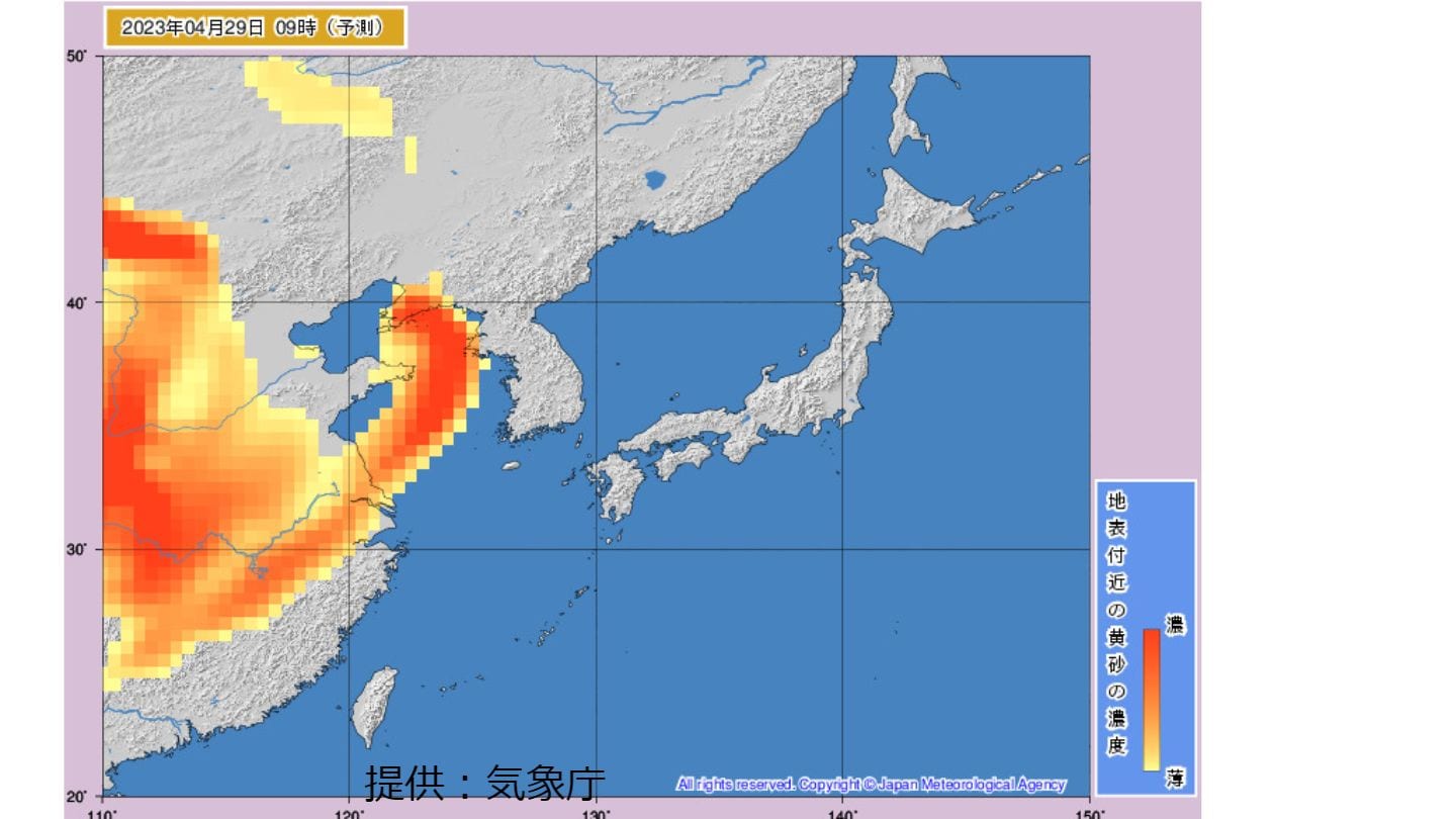 気象庁の黄砂解析予測図によりますと、黄砂はあす(4月29日)夜に西日本に到達するとみられていて、中国地方・四国地方を30日の未明に通り抜け、30日の午後には北海道・北東北を飛来する予測となっています。