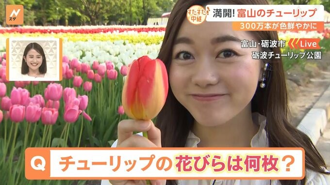 「歩いて発見!すたすた中継」。GWを前に満開を迎えたチューリップ公園から富山・チューリップテレビの中川環アナウンサーがお届けします。