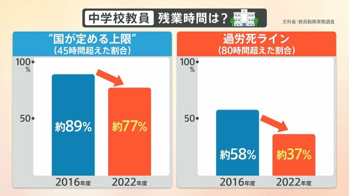 中学校の教員を対象にしたデータでは、“国が定める上限”である残業45時間を超えた割合が、2016年度だと約89%。2022年度の調査では約77%で、2016年度より減ったとはいえ、まだ8割近くです。