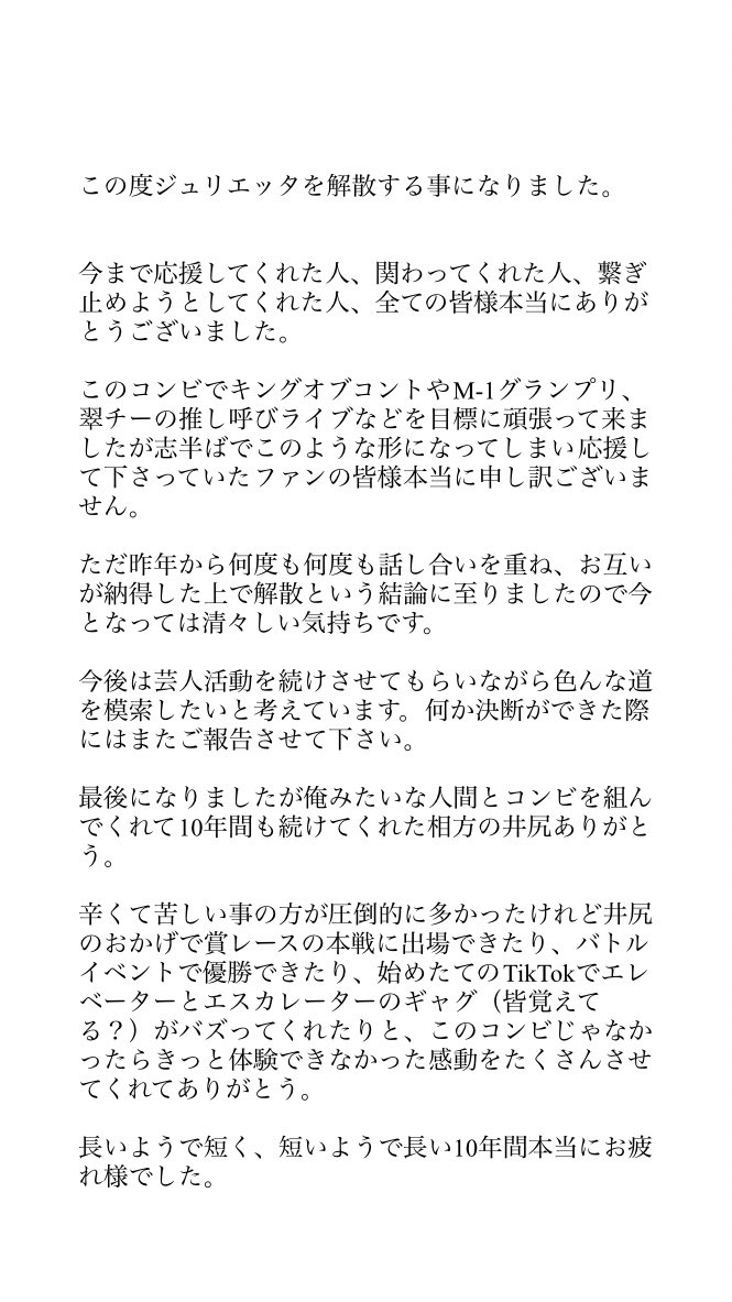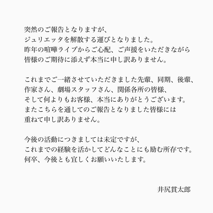 井尻貫太郎さんは自身のツイッターで解散について「ご声援をいただきながら、皆様のご期待に添えず本当に申し訳ありません」と、綴り「今後の活動につきましては未定ですが、これまでの経験を活かしてどんなことにも励む所存です。」と、その思いを明かしています。