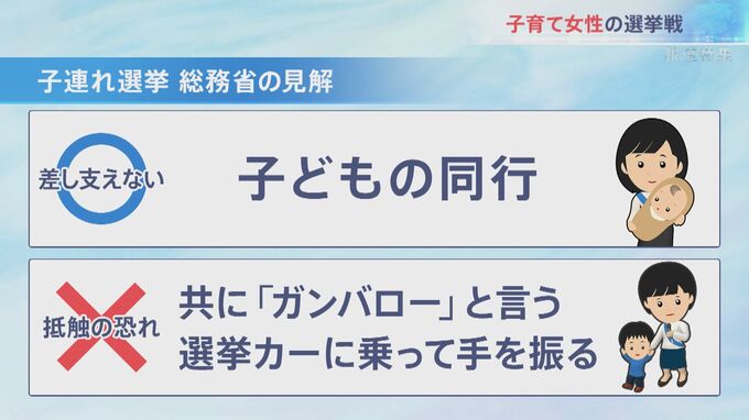 あいまいになっていた子連れ選挙のルールについて、総務省は2023年3月に見解を発表した。その中の事例では、子どもを同行させているだけなら問題ないとされた。だが、一緒に「ガンバロー」コールをするなど、子どもが投票を働きかける行動をした場合は公職選挙法に抵触する恐れがあるとされた。