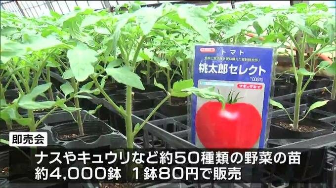 気仙沼市の本吉響高校で開かれた即売会にはナスやキュウリなどおよそ50種類の野菜の苗およそ4000鉢が並び、いずれも1鉢80円で販売されました。