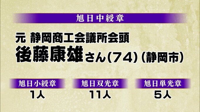 2023年の春の叙勲が発表され、静岡県内では80人が受章の栄誉に輝きました。社会で顕著な功績を挙げた人に贈られる「旭日章」は18人で、「旭日中綬章」を元静岡商工会議所会頭で静岡市の後藤康雄さんが受章しました…