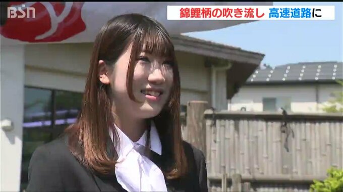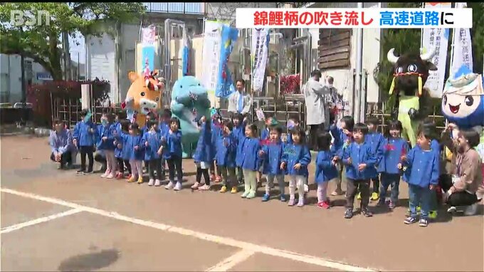 この吹き流しはNEXCO東日本が長岡市と小千谷市、長岡造形大学と連携して作ったもので、“ニシキゴイ発祥の地”を世界に知ってもらうのが狙いです。地元の園児たちは『こいのぼりの歌』で、地域の宝が描かれた吹き流しを歓迎しました。