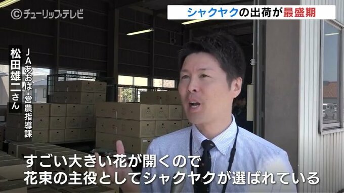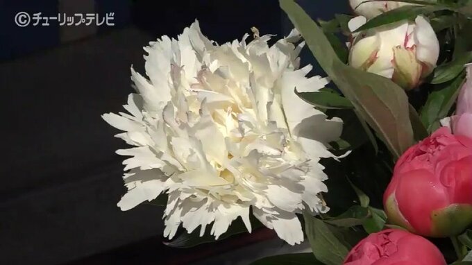 「すごい大きい花が開くので花束の主役としてシャクヤクが選ばれている、(母の日に)日頃の感謝の気持ちを込めてあおばのシャクヤクをぜひ贈っていただきたいです」